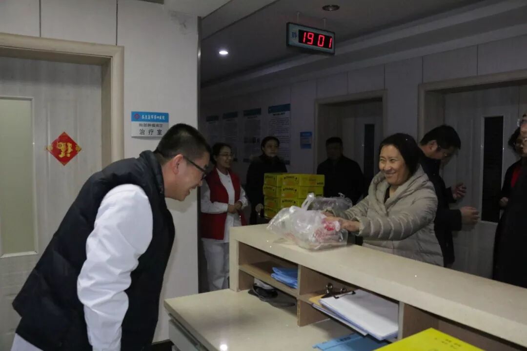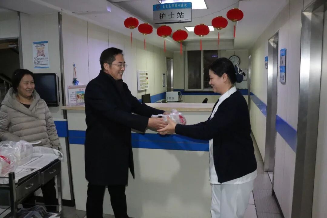 2019年2月4日,除夕之夜,市第四医院院长李仕武及院领导班子成员与相关职能科室负责人来到医院,向坚守在工作岗位的医护人员和因治疗无法回家过年的住院患者表示亲切的慰问,并带来了慰问的饺子和水果。看到值班人员忙碌的身影,院领导非常感动,亲手将一盒盒热气腾腾的饺子送到大家的手上,对大家在万家团圆时仍坚守岗位,舍小家、顾大家,无私奉献的精神表示感谢,同时感谢职工家属对医务工作者这份神圣工作的支持和理解。尽管外面天寒地冻,尽管除夕不能团圆,但是大家依然感受到了春一般的温暖,感受到了家一般的热情。